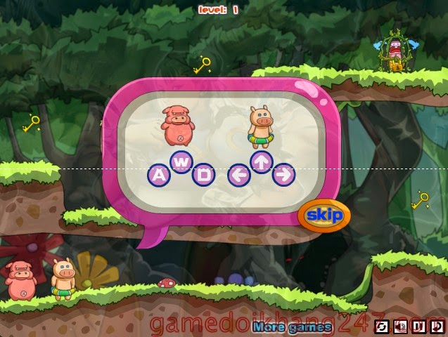 Hướng dẫn chơi game: Lợn béo A,D - di chuyển W - nhảy S - nhặt/ném đá Lợn phao Phím trái, phải - di chuyển/bơi Phím lên - nhảy