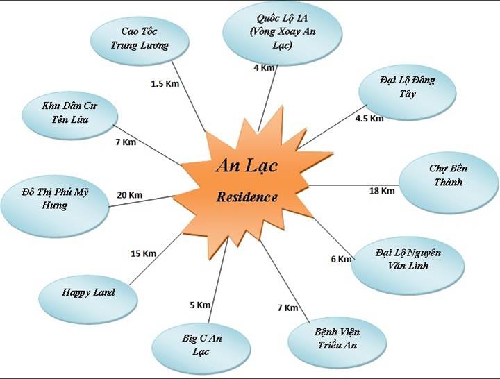 Trong khu dan cu An Lac Resident có những tiện ích:Khu Nhà Liên Kế Vườn: An Lac Residence- Diện tích: 69.033 m2 - Tổng số căn: 662 - Tầng cao: 1 – 5 tầng. Khu hành chính – Văn Hoá: An Lac Residence - Diện tích khuôn viên: 1.465m2 - Diện tích xây dựng: 586m2 - Mật độ xây dựng: 40% - Tầng cao: 3 tầng Khu Thương Mại – Dịch vụ: An Lac Residence - Diện tích khuôn viên: 2.213 m2 - Diện tích xây dựng: 885,2 m2 - Mật độ xây dựng: 40% - Tầng cao 3 tầng Khu Trung tâm y tế: An Lac Residence - Diện tích khuôn viên: 1.481 m2 - Diện tích xây dựng: 592,4 m2 - Mật độ xây dựng 40% - Tầng cao: 3 tầng Khu Trường mầm non: An Lac Residence - Diện tích khuôn viên: 2.001 m2 - Diện tích xây dựng: 800,4 m2 - Mật độ xây dựng: 40% - Tầng cao: 2 tầng Tiện ích và liên kết vùng của Du An An Lac Residence: