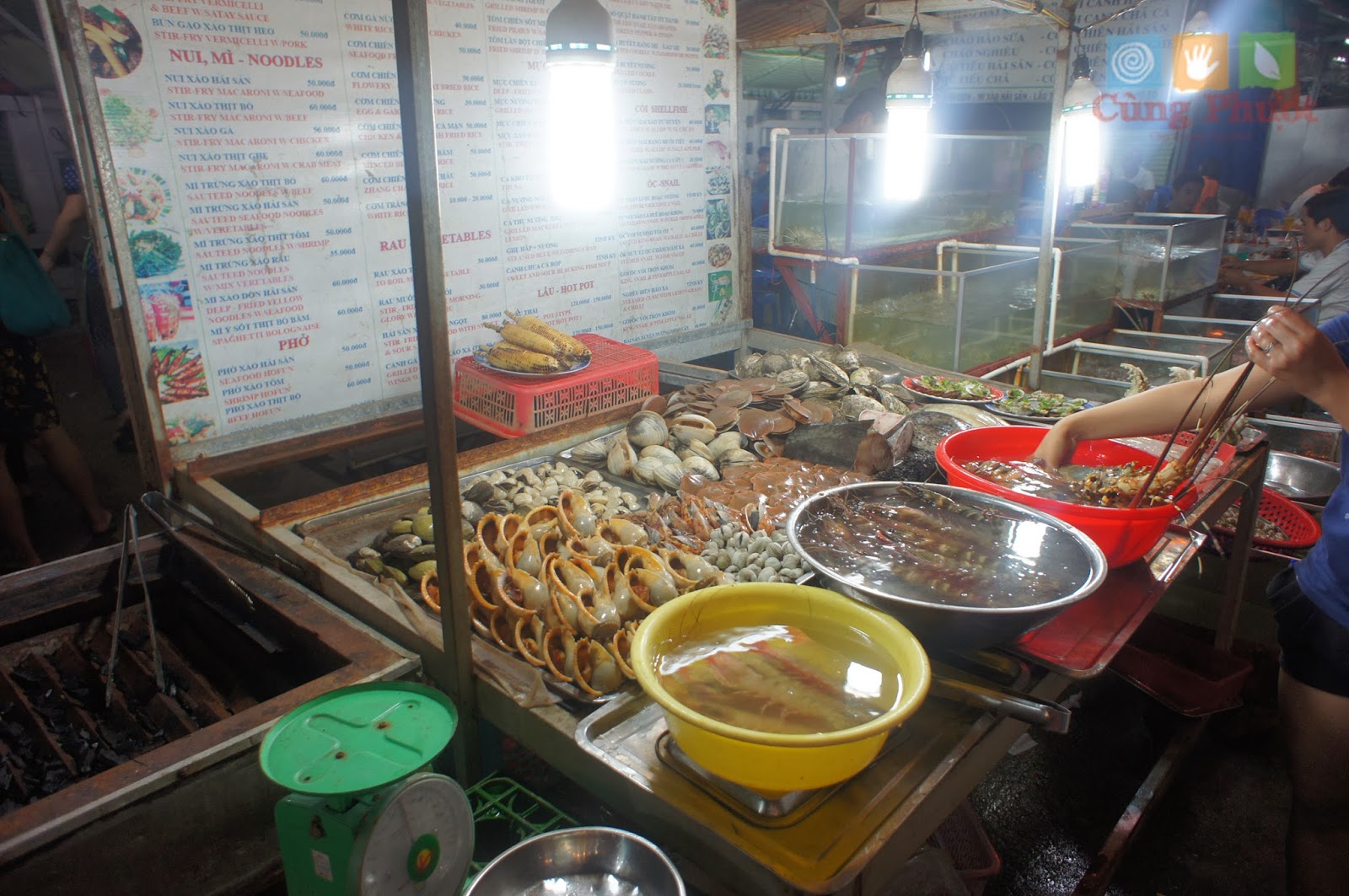 Chợ đêm Dinh Cậu, nơi ăn hải sản tuyệt vờiTin du lich - Chợ đêm Dinh Cậu là nơi thu hút đông du khách nhất vào buổi tối, chợ có hơn 100 gian hàng gian hàng trải dài hai bên vệ đường Võ Thị Sáu. Du khách đến với chợ đêm Dinh Cậu có thể thỏa thích mua sắm và thưởng thức những món ăn ngon của đảo Phú Quốc với đầy đủ các loại hải sản tươi sống được trưng bày đẹp mắt. Từ đường Trần Hưng Đạo rẽ vào Võ Thị Sáu, du khách có thể nghe thấy mùi hải sản nướng tỏa khói thơm phức từ lò than đỏ rực đặt trước mỗi gian hàng. Cạnh lò là bàn trưng bày hải sản khá bắt mắt. Hầu hết khách đều ghé quan sát lò nướng, các loại hải sản trưng bày, hỏi giá và chọn món ăn ưng ý trước khi quyết định vào ngồi bàn ăn kê trên lề đường.