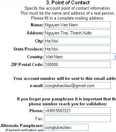 Address: Địa chỉ của bạn (Không nhất thiết phải chính xác vì cái này hầu như không sử dụng. Để rút tiền mặt bạn chỉ cần nhớ số tài khoản e-gold và mật khẩu là OK rùi. Tất nhiên nếu chính xác thì càng tốt)