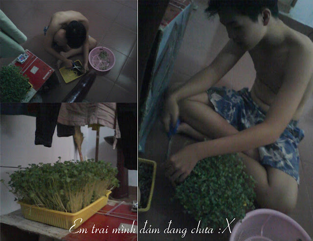 Đây là em trai của mềnh, đang thu hoạch rau mầm. Nhìn ẻm đảm đang vậy thôi chứ làm biếng chảy thây ra =.=